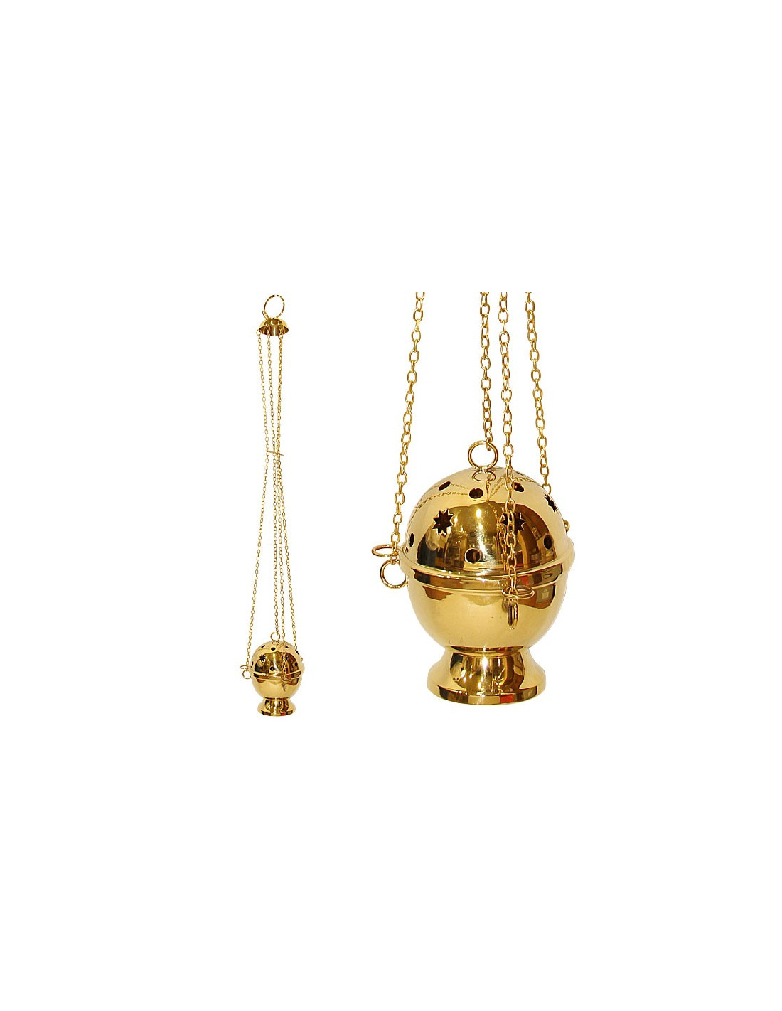 Deze wierookbrander van gevernist koper is voorzien van kettingen om hem op te hangen of om hem op zijn sokkel te zetten. Het deksel is versierd met sterren en cirkels. Het is perfect voor religieuze ceremonies zoals missen.