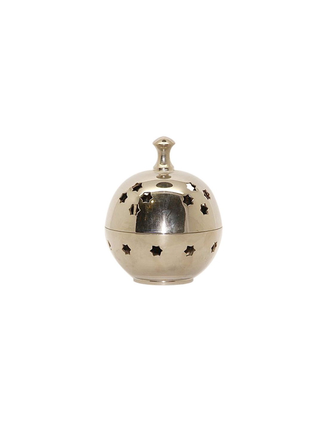 Dit model wierookvat is bolvormig, een sober en aantrekkelijk ontwerp, heeft openingen in de vorm van een ster. Het geheel heeft een mooie zilveren kleur. Het interieur is groot genoeg om de kolen in te leggen.