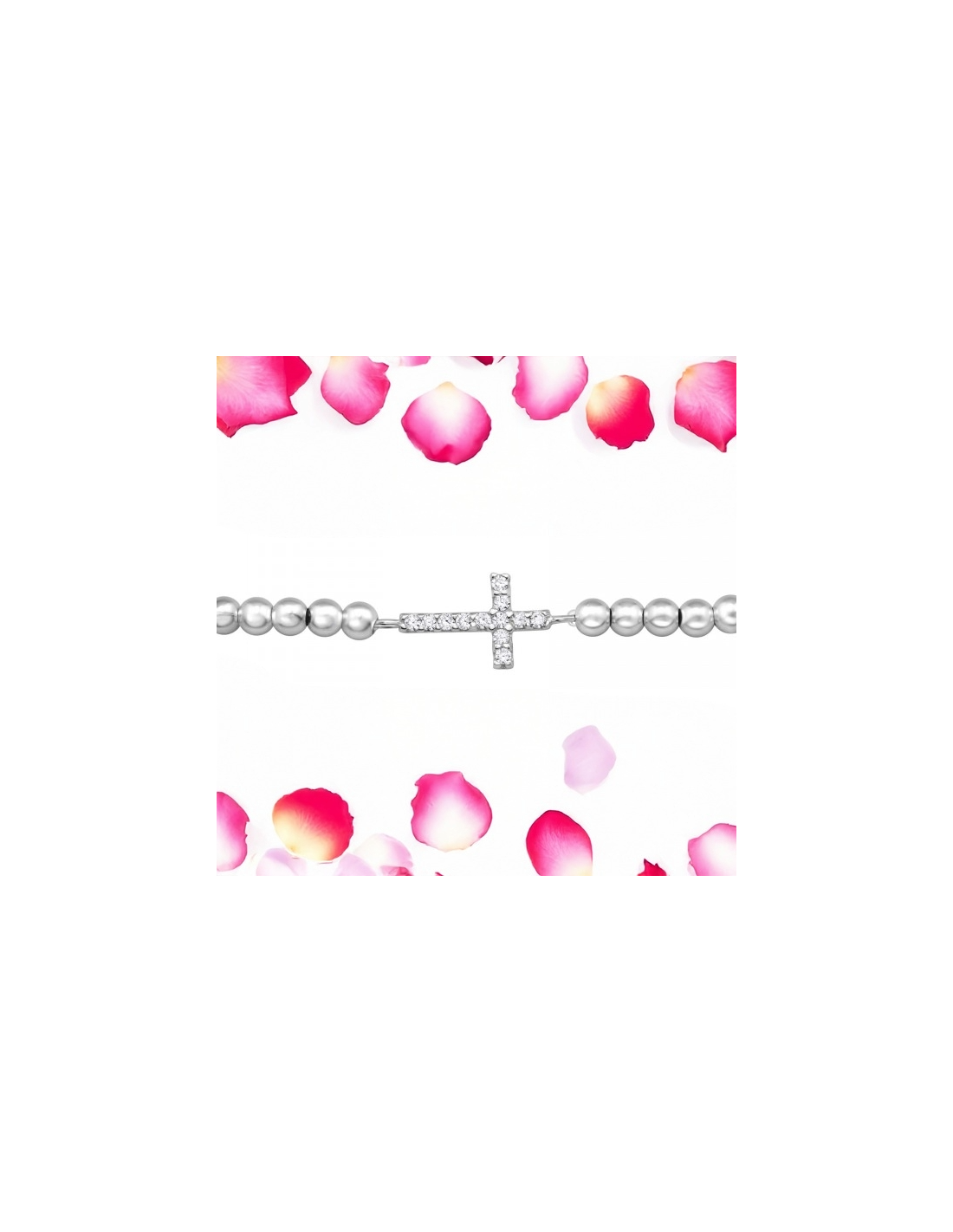 Kruisarmband van 925 zilver met 12 zirkonia-steentjes. Elegant, verfijnd en duurzaam, ideaal als religieus geschenk of dagelijks accessoire.