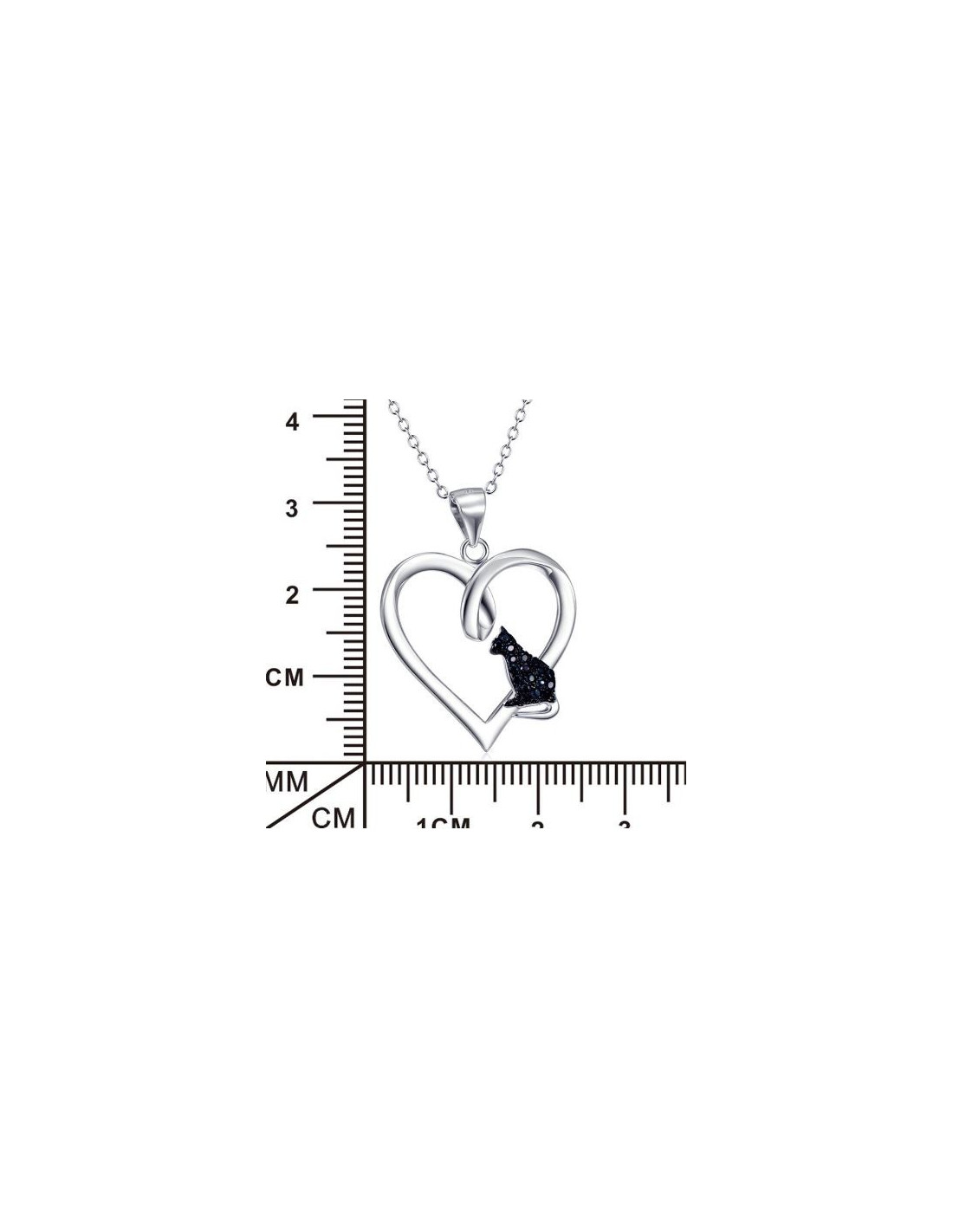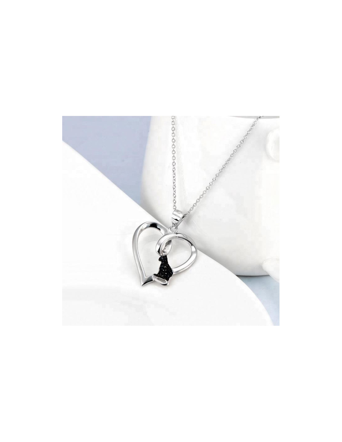 Ketting en hanger in zilver 925. De ketting is een klassieke zilveren ronde schakelketting. De hanger is hartvormig met een zwarte kat erin, deze laatste is ingelegd met zwarte zirkoenen.