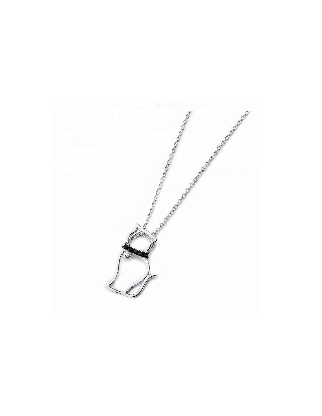 Ketting en hanger in 925 zilver. De ketting is een klassieke ronde schakelketting in zilver. De hanger heeft de vorm van een gestileerde kat, een delicaat en fijn zilveren silhouet. De ketting van de kat is bedekt met zwart-witte CZ-kristallen.