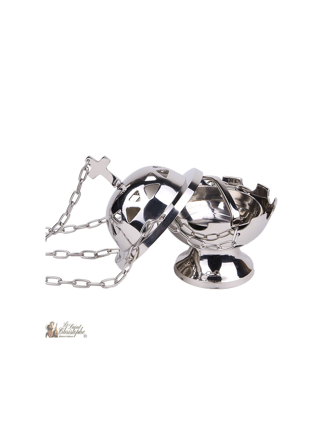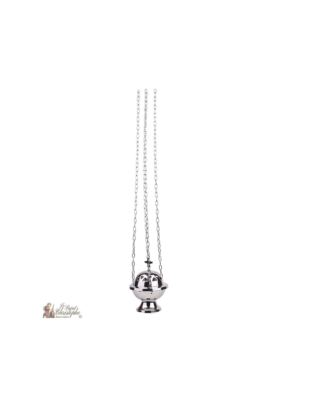 Dit wierookvat is gemaakt van verzilverd metaal. Het is versierd met kettingen waarmee het kan worden opgehangen. Het deksel is versierd met driehoeken die een geometrische fries vormen, en bekroond met een christelijk kruis.