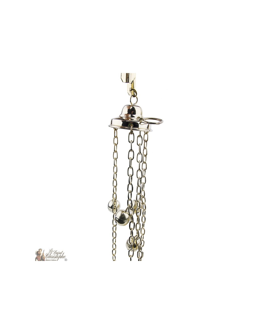 Dit wierookvat is over het hele oppervlak fijn gebeeldhouwd, versierd met delicate plantmotieven. Het is voorzien van kettingen, zodat het kan worden opgehangen. De kettingen zelf zijn voorzien van zacht rinkelende belletjes. Het wierookvat heeft een groot formaat, perfect voor religieuze ceremonies.