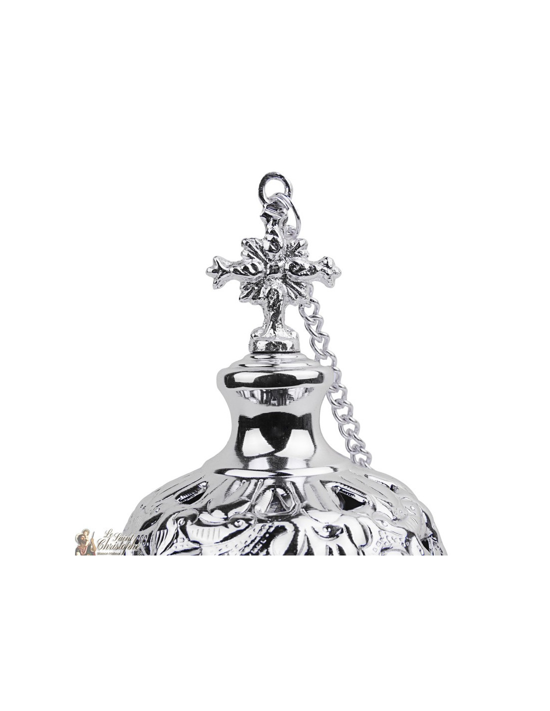 Deze verzilverde hangende wierookbrander is op het oppervlak gegraveerd met een prachtig plantenfries en bekroond met een rijk versierd kruis. Het deksel heeft een gemakkelijke en hoge grip, vooral dankzij het kruis. De gaten zijn discreet, snijden in de witte ruimten van de fries en geven het meer reliëf. De wierookbrander bevat ook een rooster voor het deponeren van de wierookstukjes en -korrels. Met de lange kettingen kan hij gemakkelijk worden opgehangen.