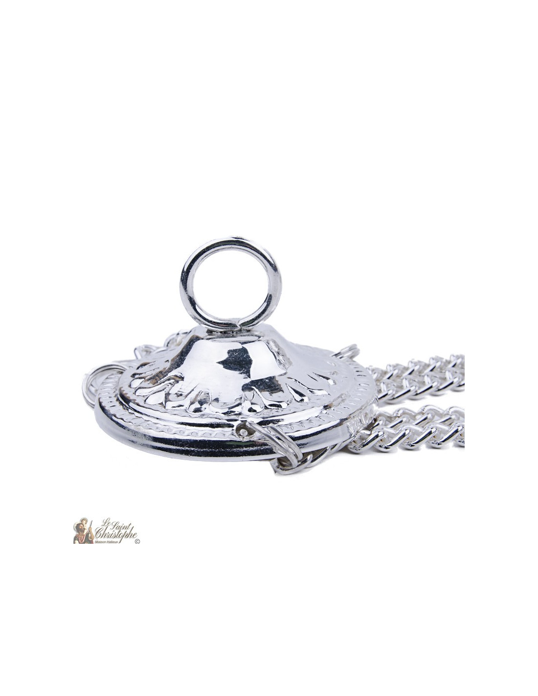 Deze verzilverde hangende wierookbrander is gegraveerd met een prachtig plantenfries op het oppervlak en bekroond met een rijk versierd kruis. Het deksel heeft een gemakkelijke, hoge greep, mede dankzij het kruis en de hopvorm die het nog groter maakt. De gaten zijn discreet, snijden in de witte ruimten van de fries en geven het meer reliëf. De wierookbrander bevat ook een rooster voor het deponeren van de wierookstukjes en -korrels. Met de lange kettingen kan hij worden opgehangen.